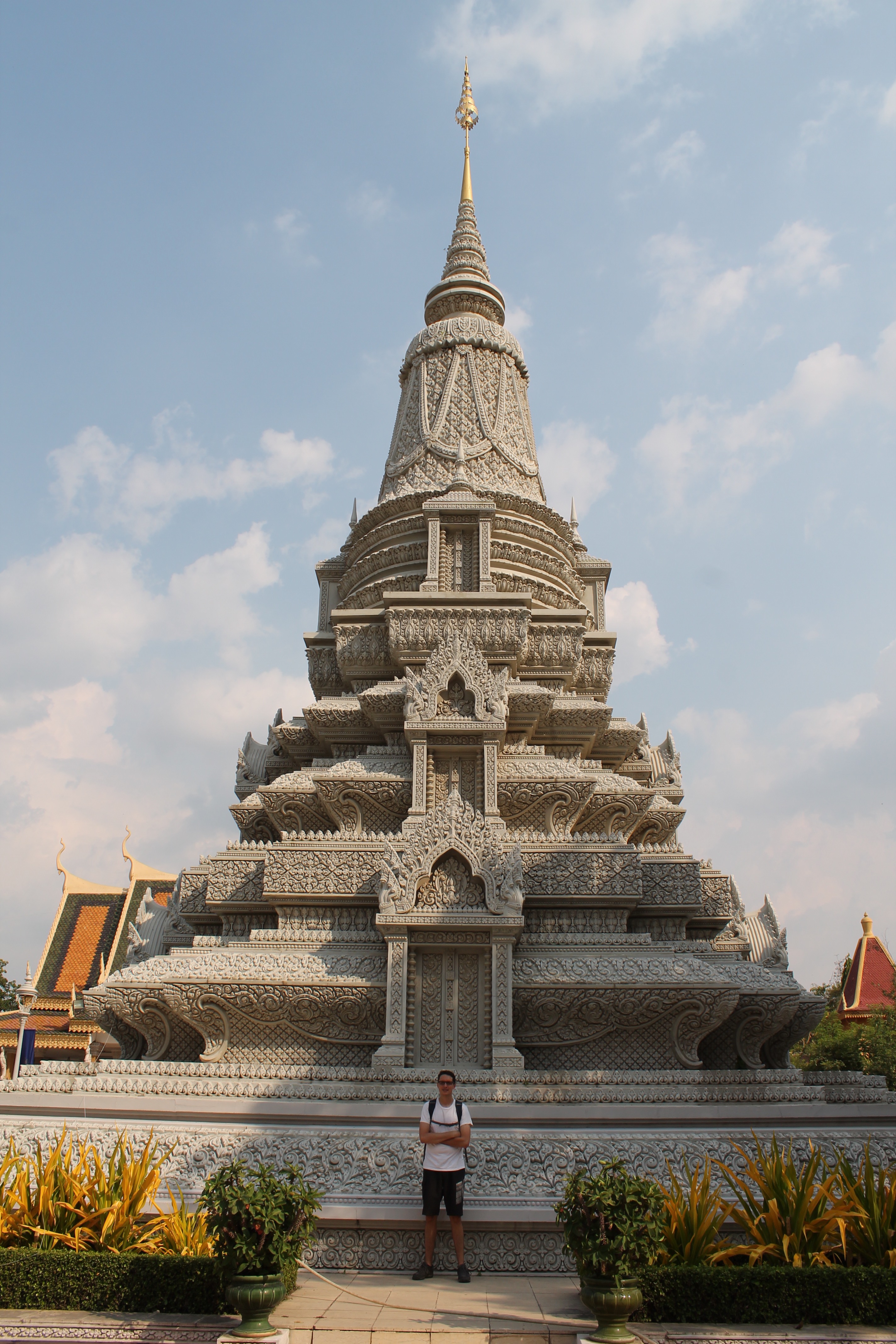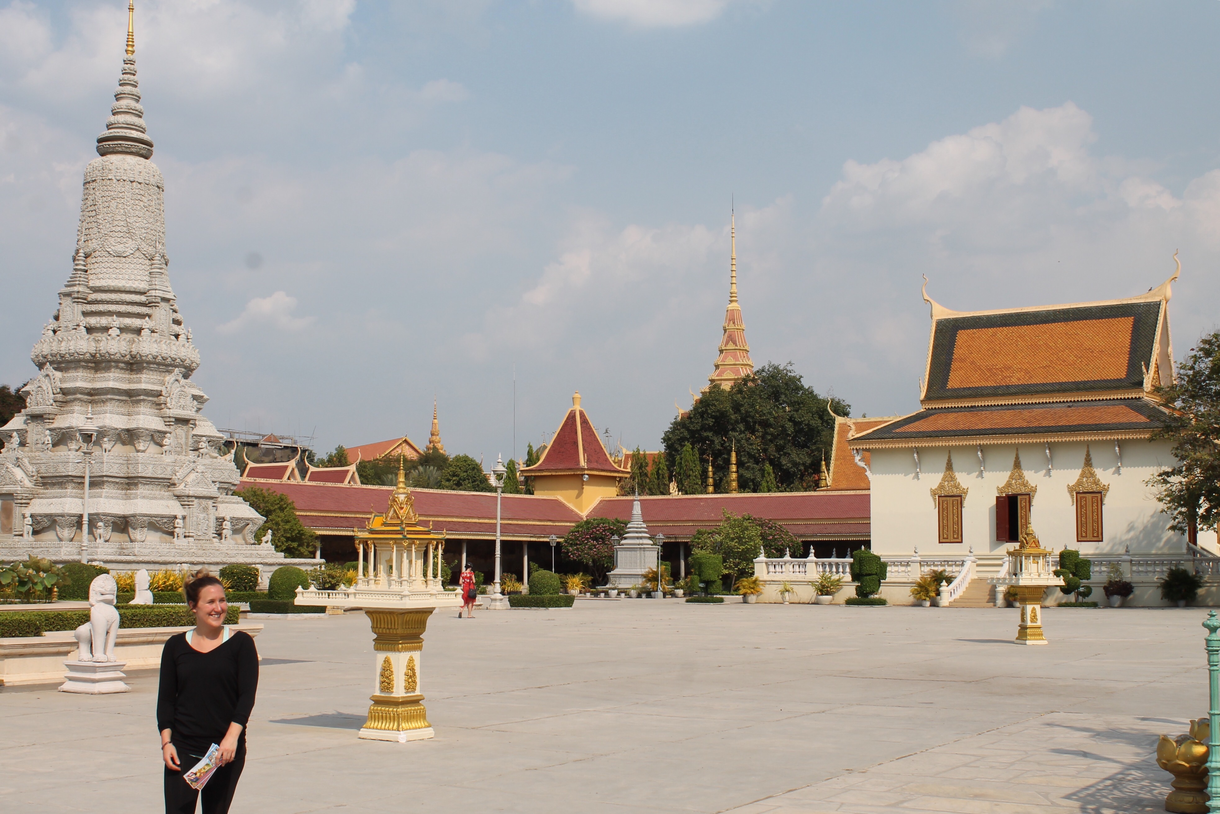 Notre visite de Phnom Penh nous a aussi permis de visiter le palace royal (le gros luxe!) où nous avons conclu que les cambodgiens ont une fascination pour les éléphants, et la pagode d’argent, où Mev a dû couvrir ses épaules, non sans rechigner (il faisait un bon 45 dégrés celsius). Cette pagode ne comporte finalement aucune composante en argent (!), mais malgré cela il est toujours impressionnant de constater les efforts déployés dans le passé et encore aujourd’hui au nom de la religion.