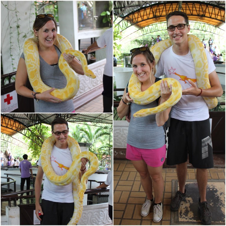 C’est à Bangkok, donc, que nous avons assisté à un gala de boxe muay thaï (succession de gars de 100 lbs qui laissent tout ce qu’ils ont sur le ring, à grands coups de genoux dans les côtes) au stade Ratchadamnoen et surtout au gambling qui a lieu dans les gradins. Cette effervescence nous a d’abord laissé bouche bée! Nous avons aussi visité la ferme des serpents où nous avons eu droit à un spectacle de cobras ben choqués. On a pu apprendre à aimer un peu les serpents. Nous avions d’ailleurs envie d’adopter un de ces reptiles, jusqu’à ce qu’on apprenne quelques jours plus tard qu’un habitant de Bangkok s’était fait arracher une partie de lui par un Boa lors de son passage au toilette (turc!) de sa résidence (on vous laisse deviner laquelle, pour des images).