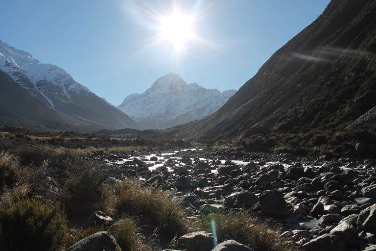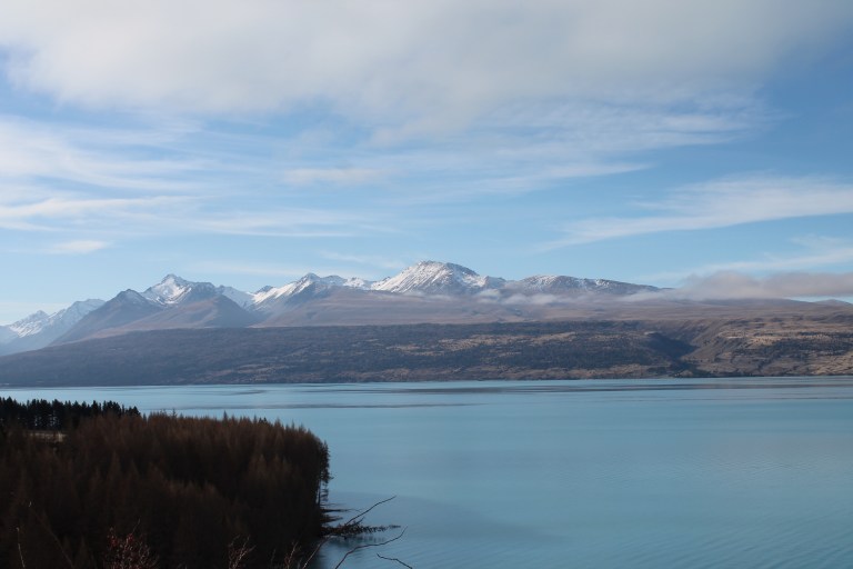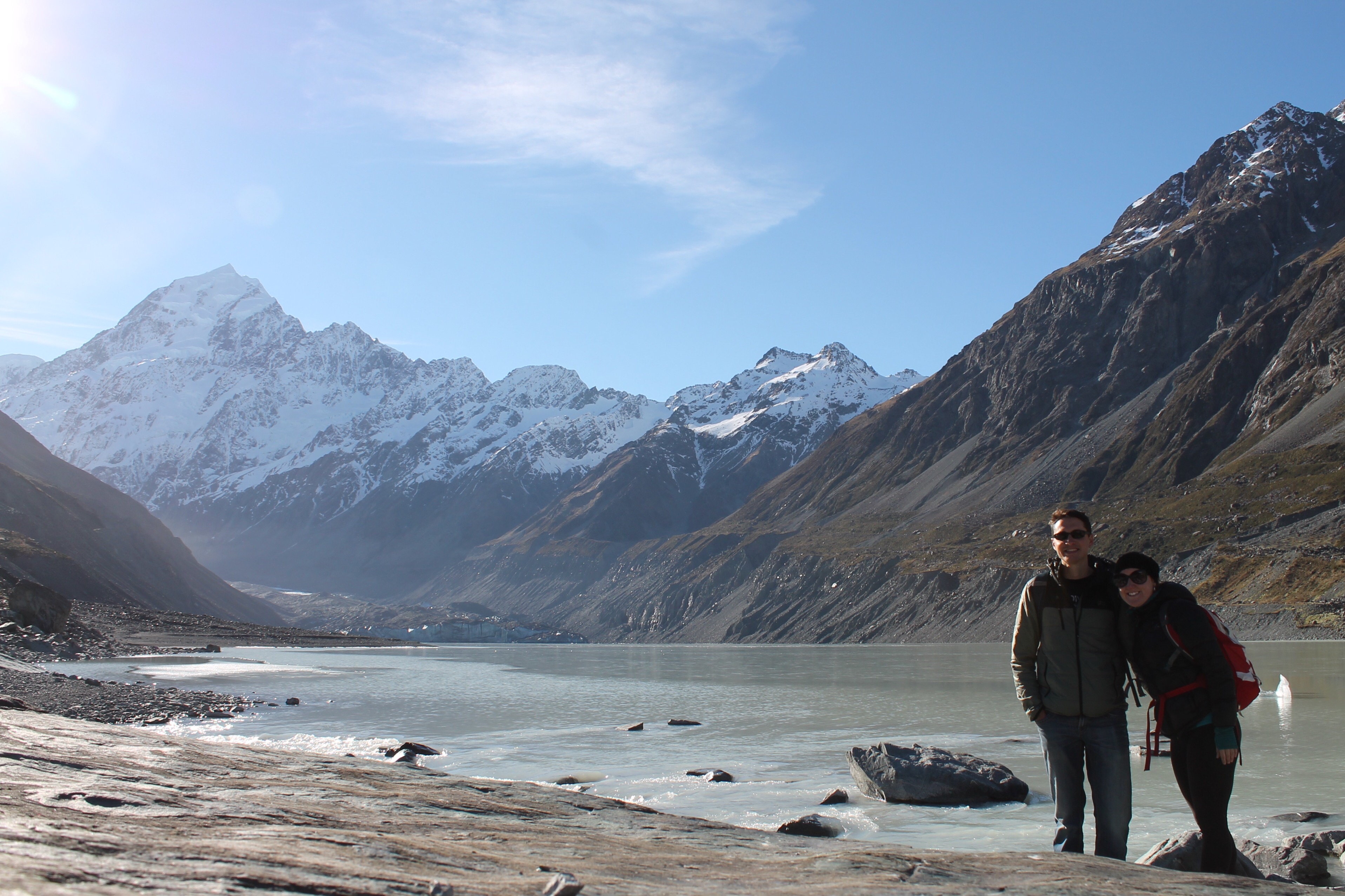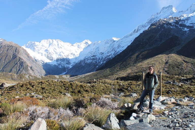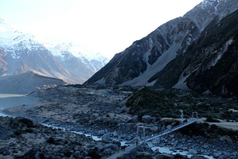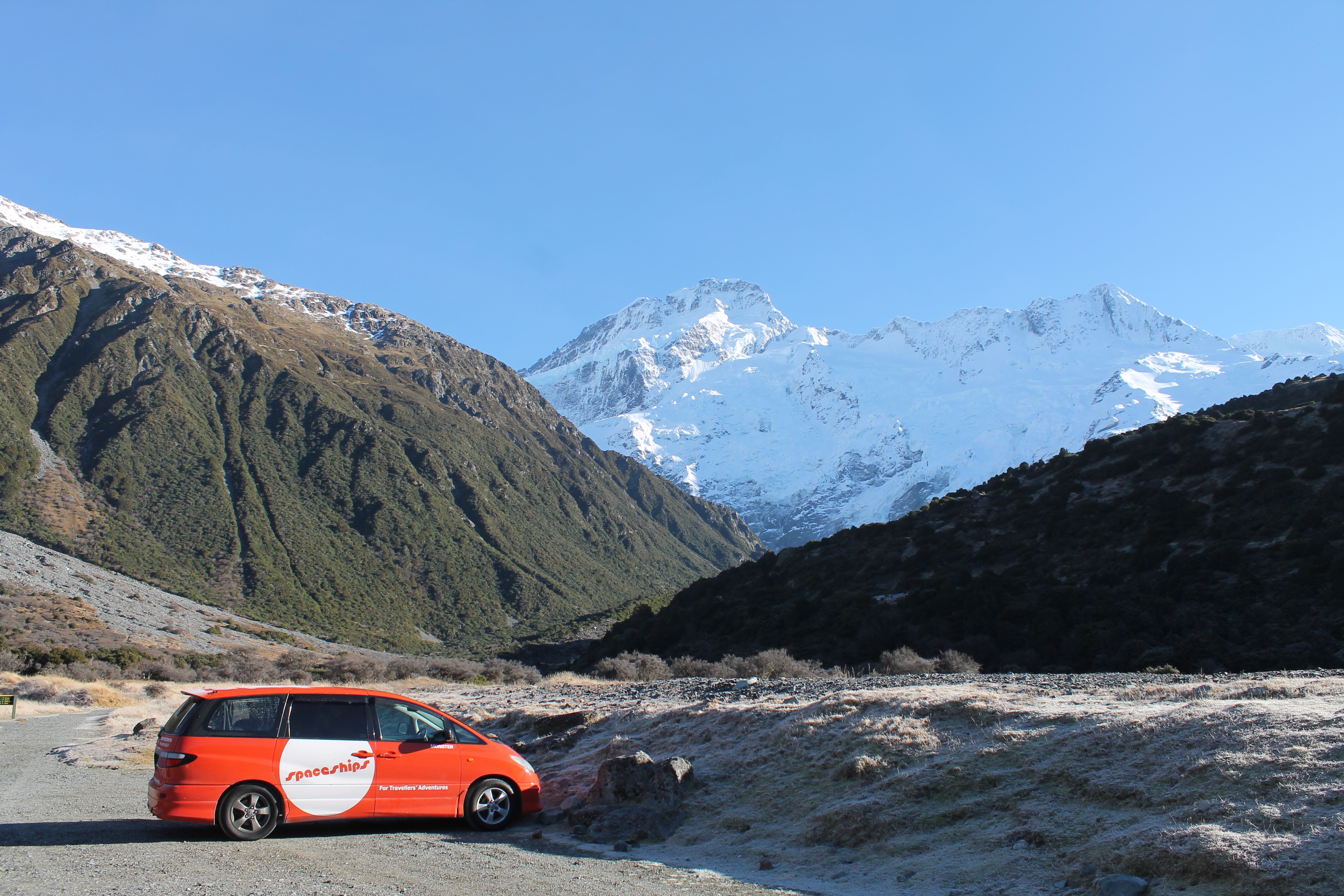 L’intérêt étant de profiter de la campagne néo-zélandaise, nous avons rapidement récupéré notre spaceship (littéralement « vaisseau spatial ») et pris la route vers le sud. C’est en chemin vers le mont Cook que Mèv a eu sa première expérience de conduite à gauche: plutôt stressant, surtout aux rond points ou sur les ponts à une seule voie! La vue sur le mont Cook au réveil le lendemain de notre arrivée à su nous réchauffer le coeur (le thermomètre, quant à lui, affichait un timide -3) et nous préparer pour notre petite « hike » vers le lac Mueller. Nous y avons croisé, comme à peu près partout en Nouvelle-Zélande d’ailleurs, plusieurs personnes habillés beaucoup trop légèrement pour l’hiver.