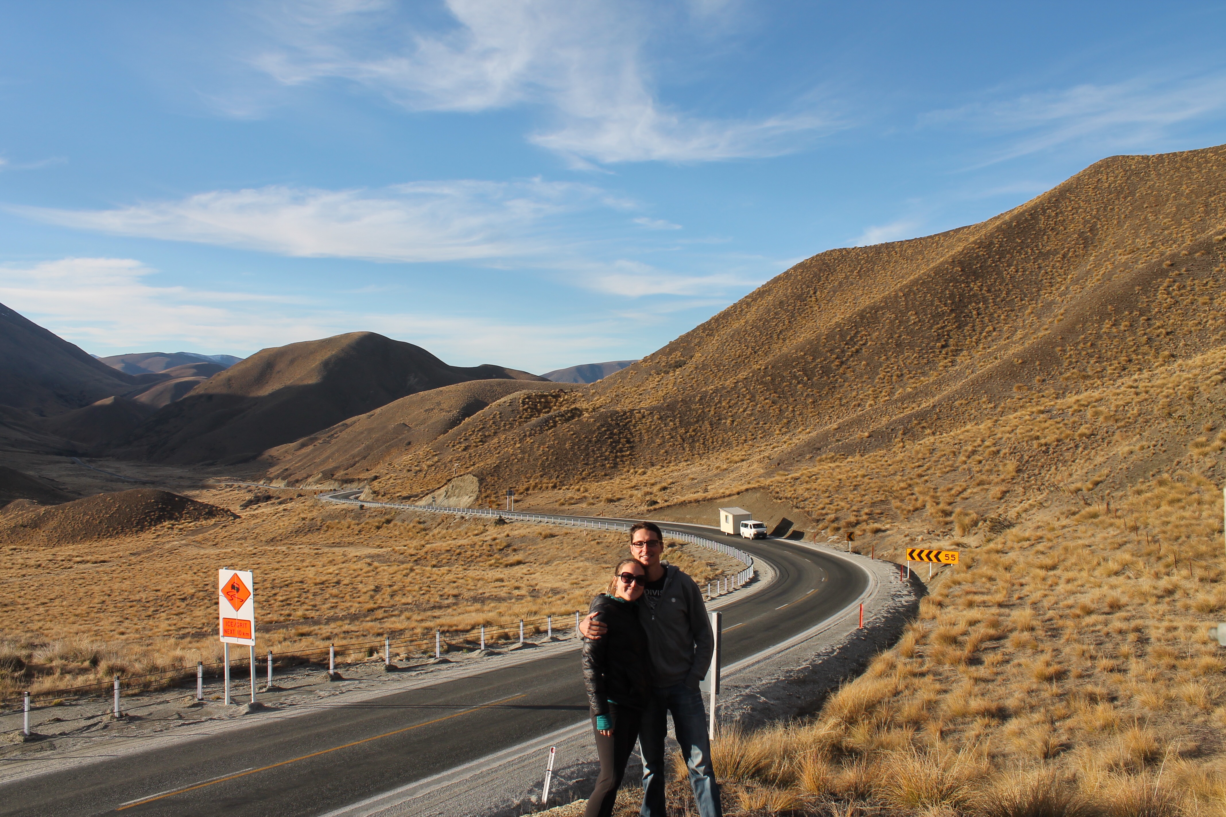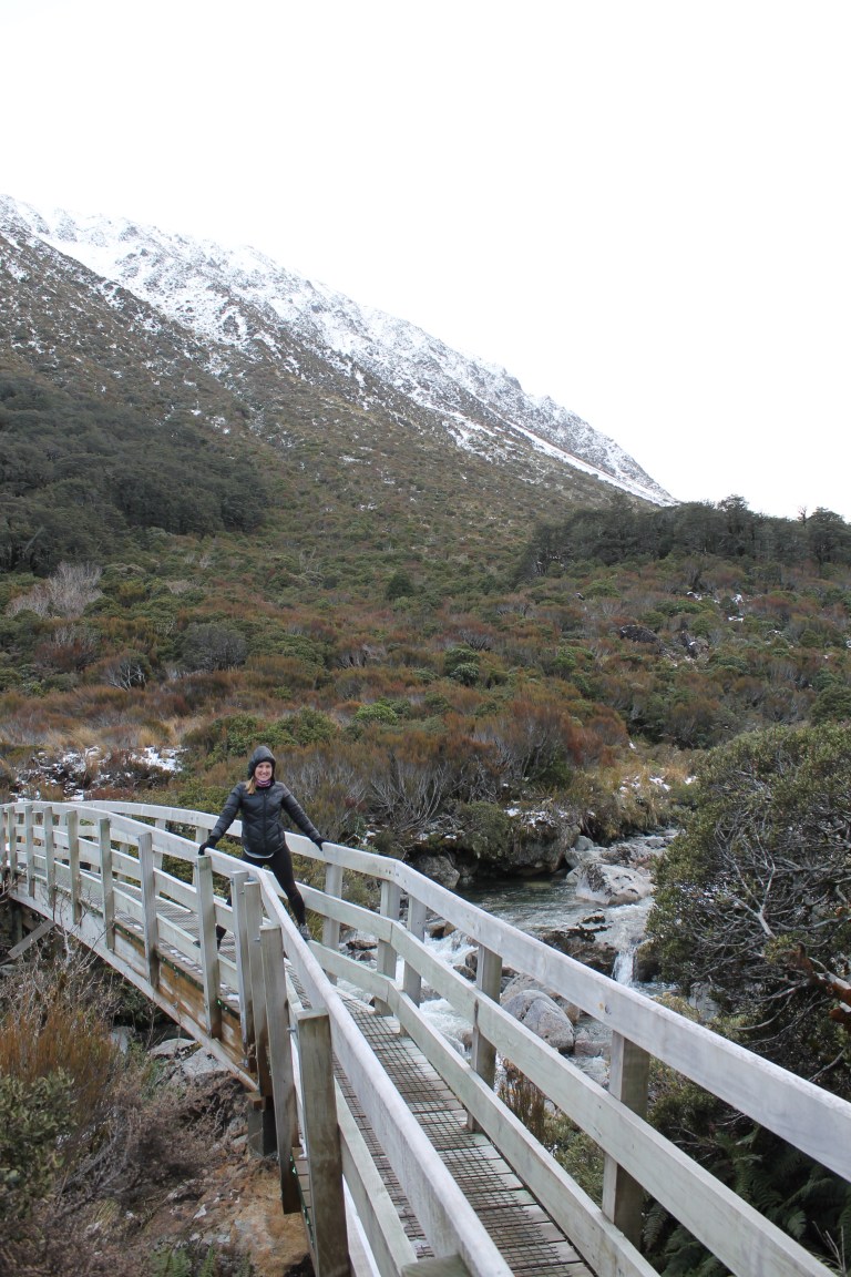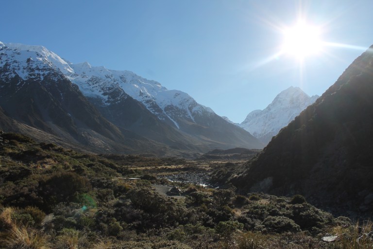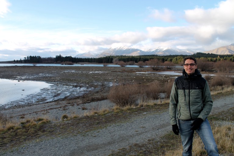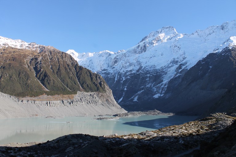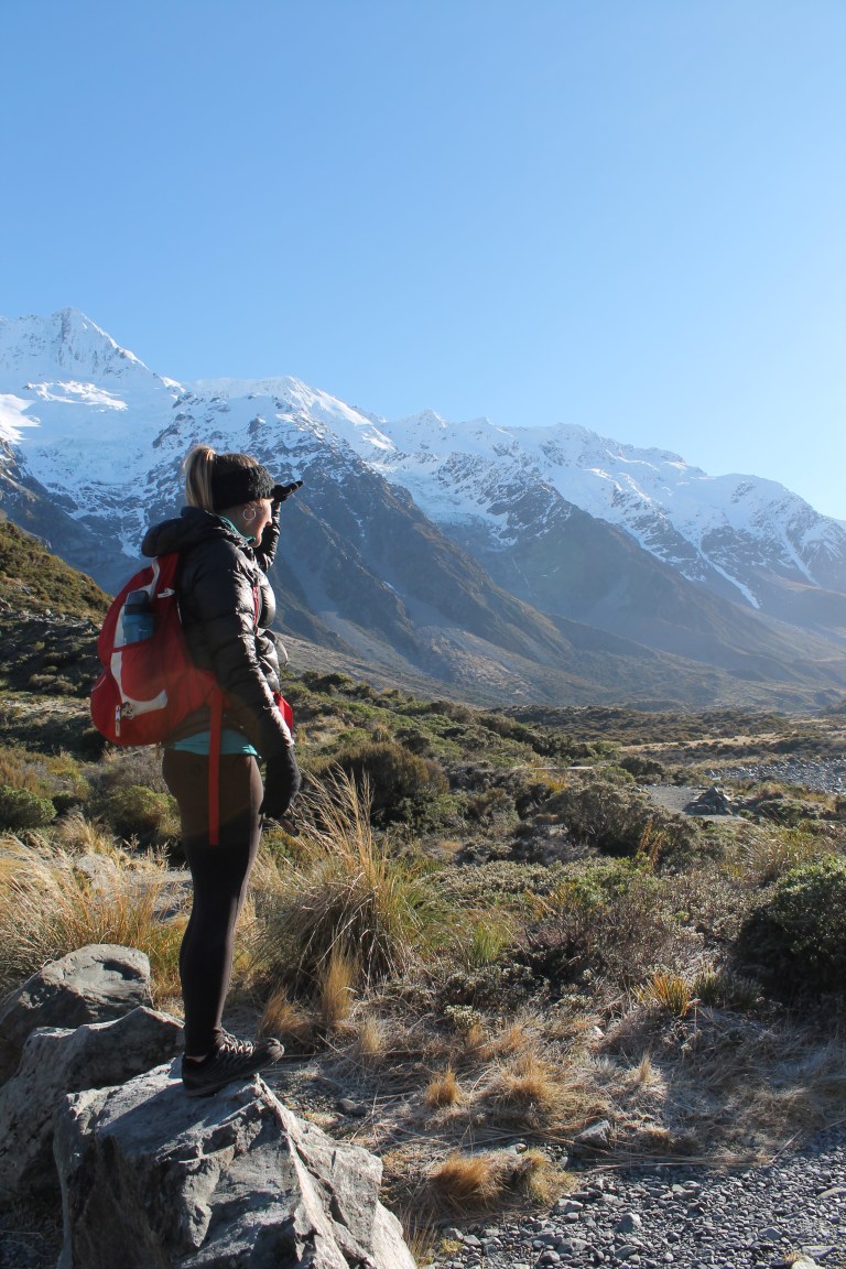 L’intérêt étant de profiter de la campagne néo-zélandaise, nous avons rapidement récupéré notre spaceship (littéralement « vaisseau spatial ») et pris la route vers le sud. C’est en chemin vers le mont Cook que Mèv a eu sa première expérience de conduite à gauche: plutôt stressant, surtout aux rond points ou sur les ponts à une seule voie! La vue sur le mont Cook au réveil le lendemain de notre arrivée à su nous réchauffer le coeur (le thermomètre, quant à lui, affichait un timide -3) et nous préparer pour notre petite « hike » vers le lac Mueller. Nous y avons croisé, comme à peu près partout en Nouvelle-Zélande d’ailleurs, plusieurs personnes habillés beaucoup trop légèrement pour l’hiver.