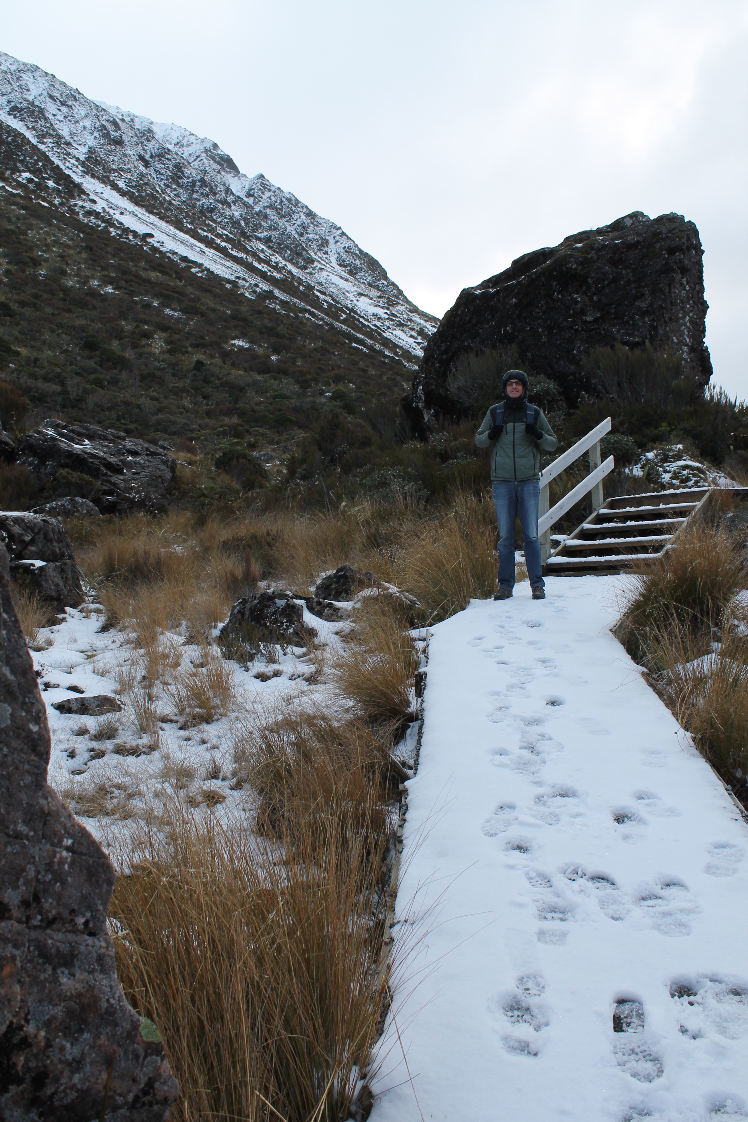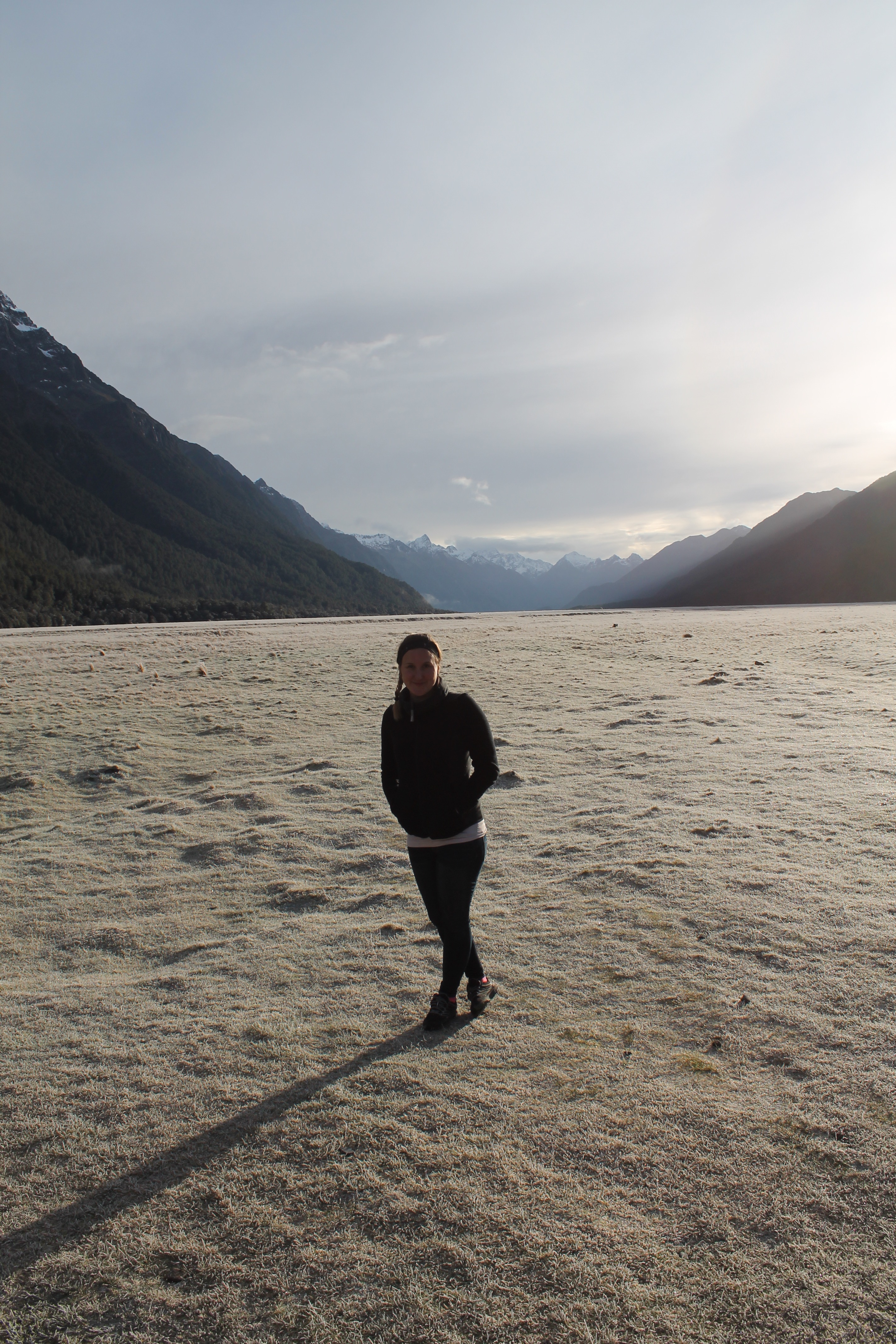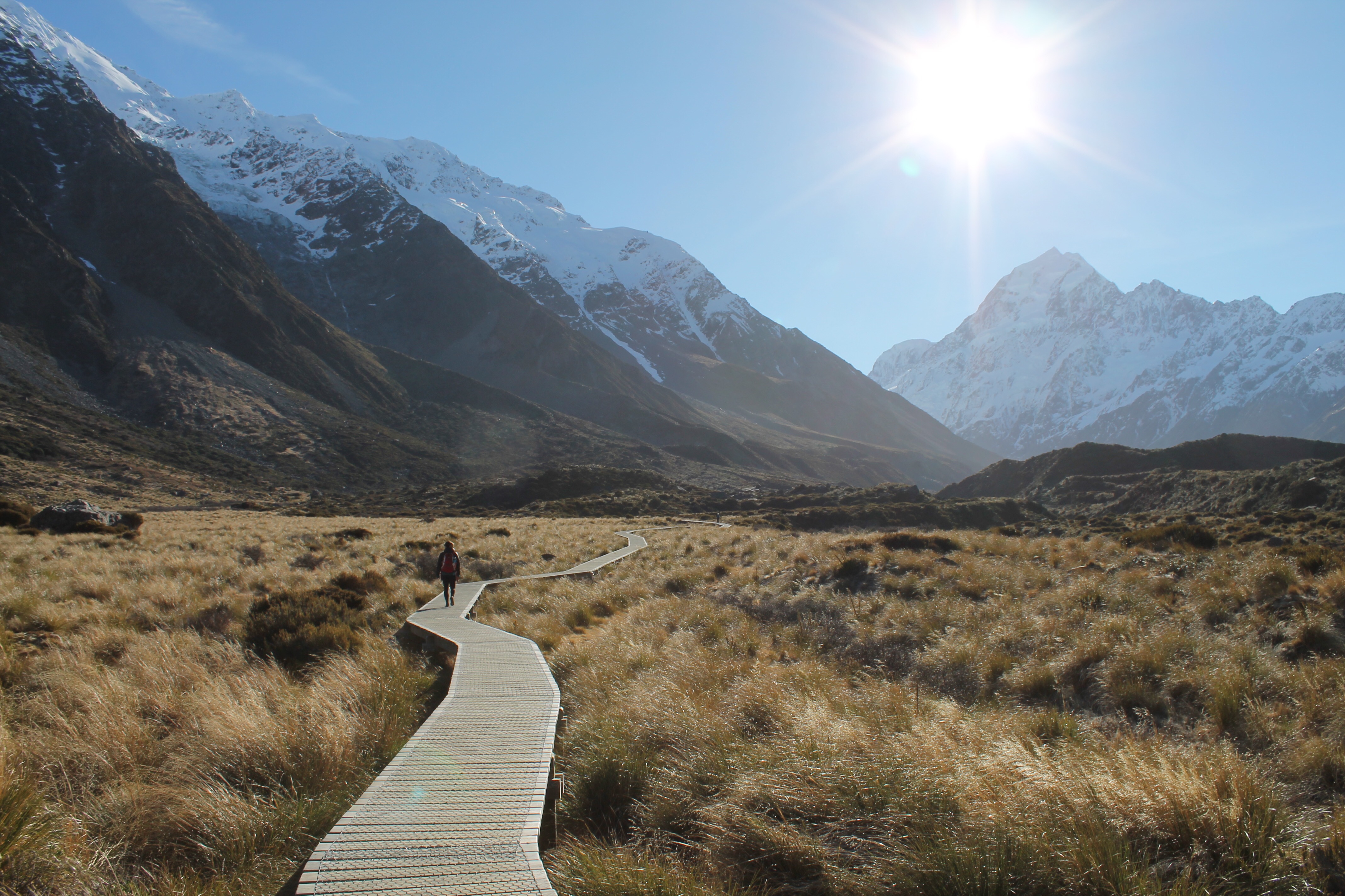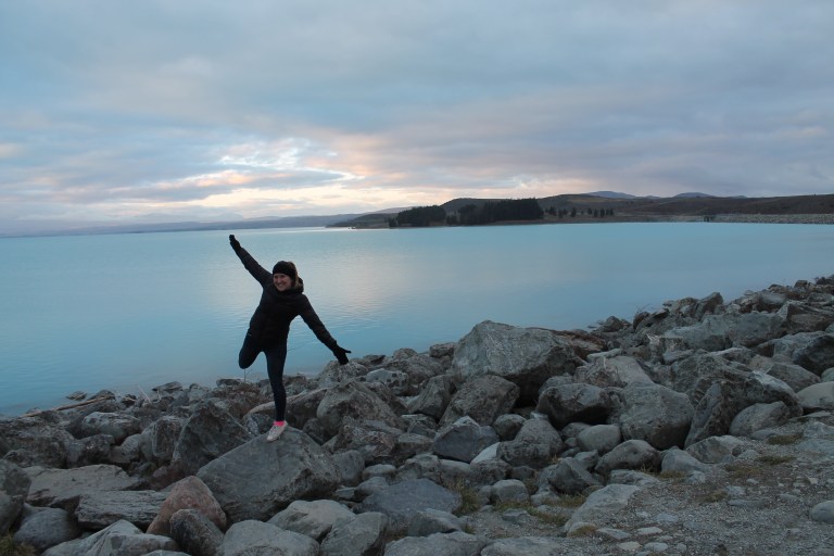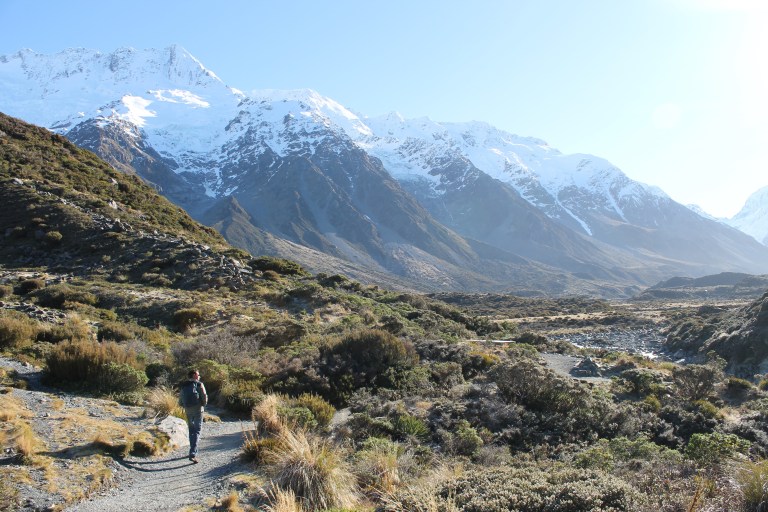L’intérêt étant de profiter de la campagne néo-zélandaise, nous avons rapidement récupéré notre spaceship (littéralement « vaisseau spatial ») et pris la route vers le sud. C’est en chemin vers le mont Cook que Mèv a eu sa première expérience de conduite à gauche: plutôt stressant, surtout aux rond points ou sur les ponts à une seule voie! La vue sur le mont Cook au réveil le lendemain de notre arrivée à su nous réchauffer le coeur (le thermomètre, quant à lui, affichait un timide -3) et nous préparer pour notre petite « hike » vers le lac Mueller. Nous y avons croisé, comme à peu près partout en Nouvelle-Zélande d’ailleurs, plusieurs personnes habillés beaucoup trop légèrement pour l’hiver.
