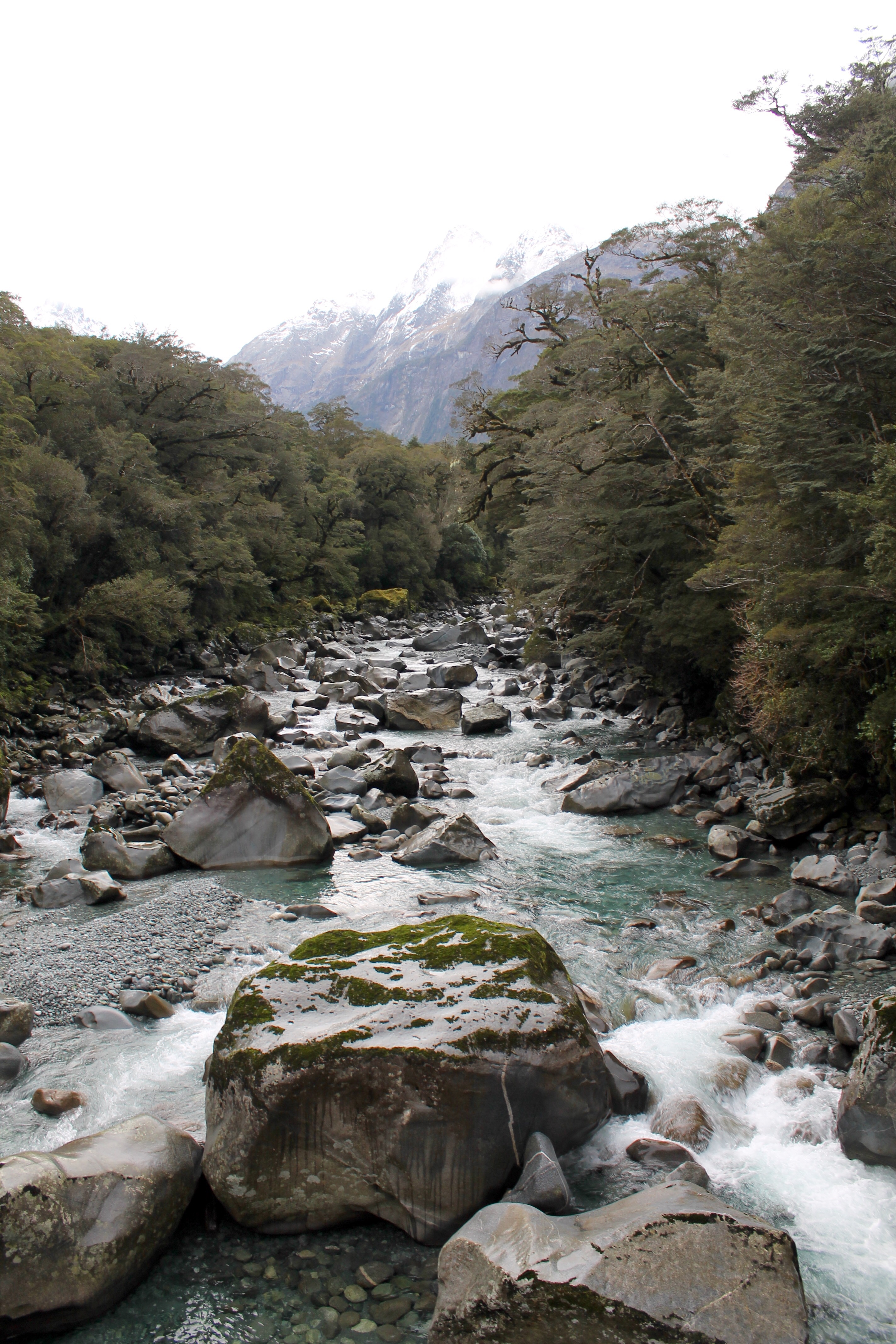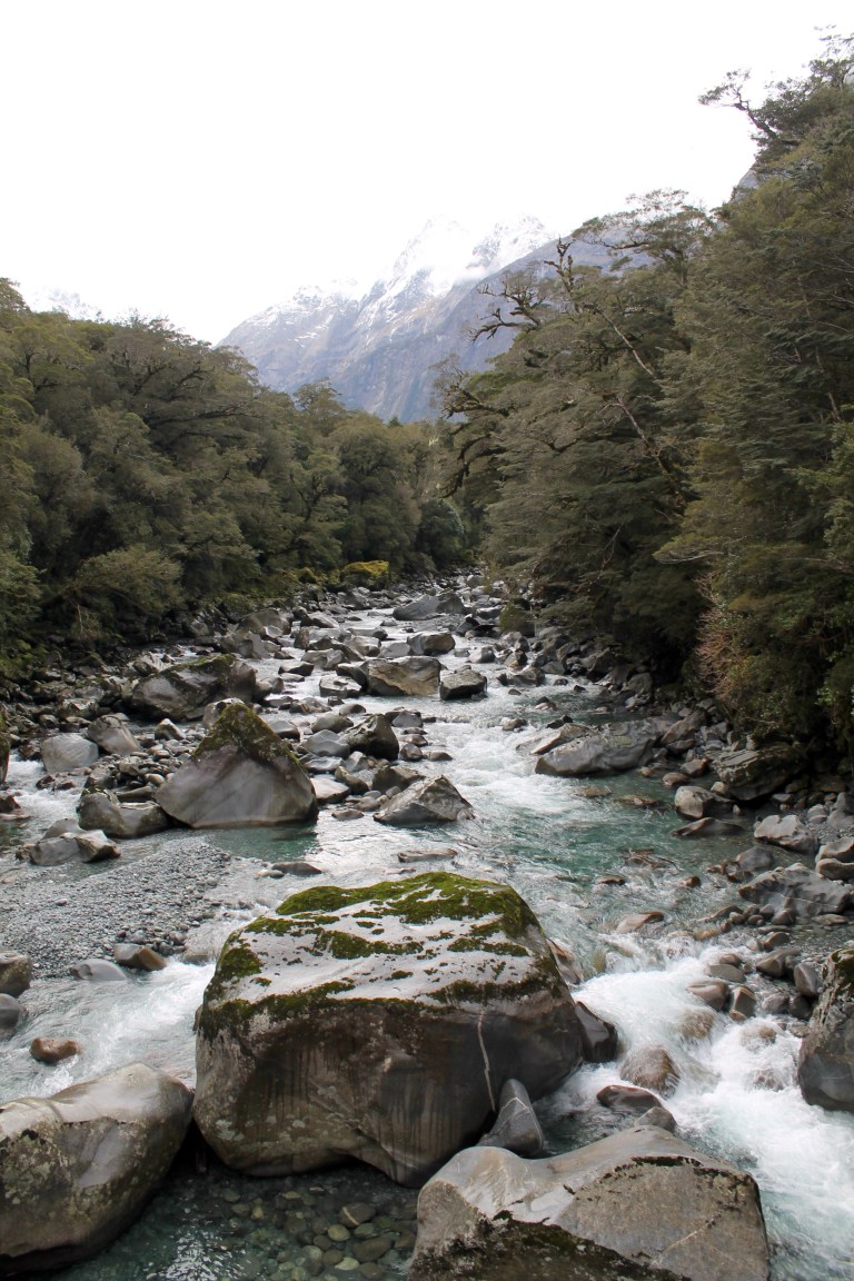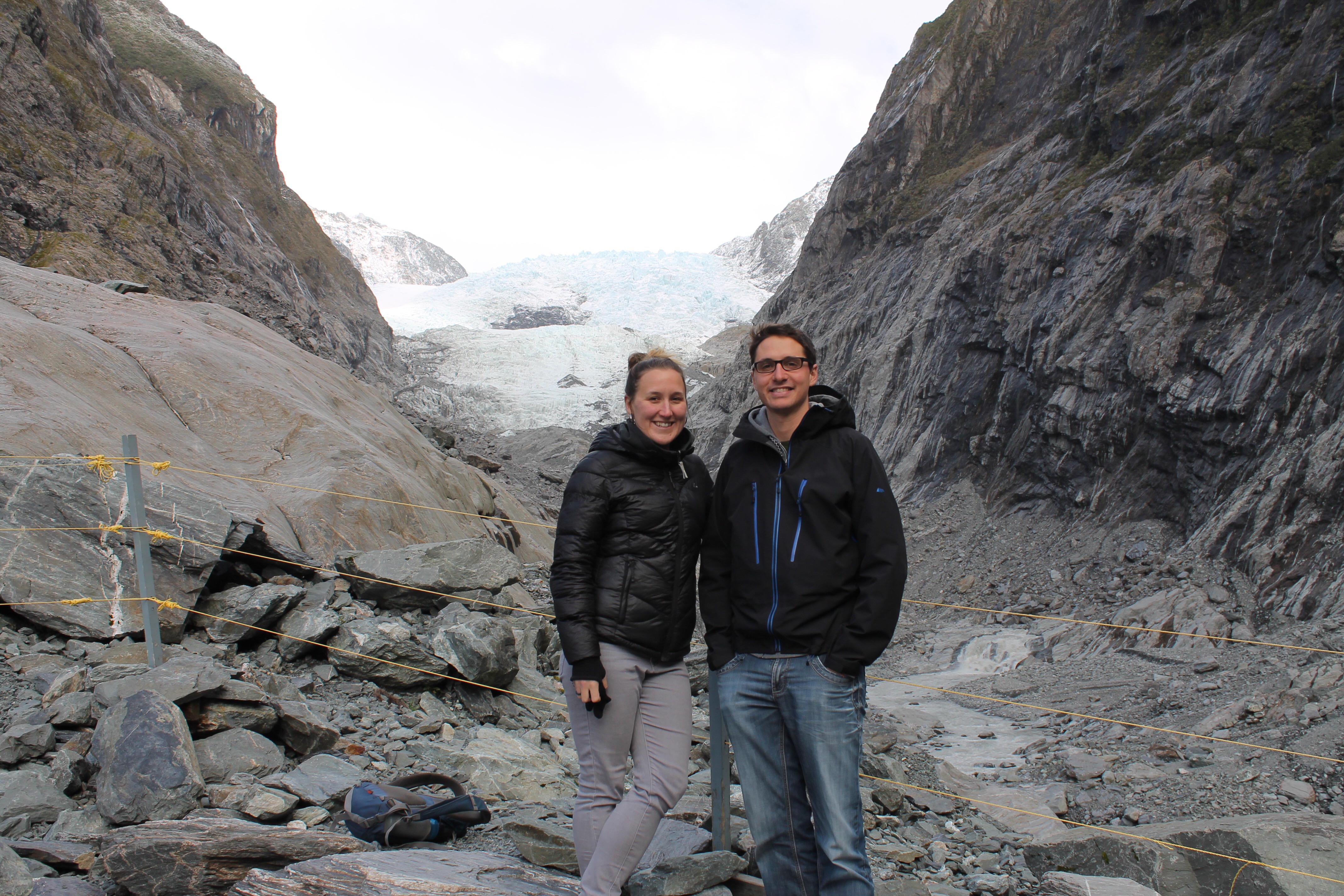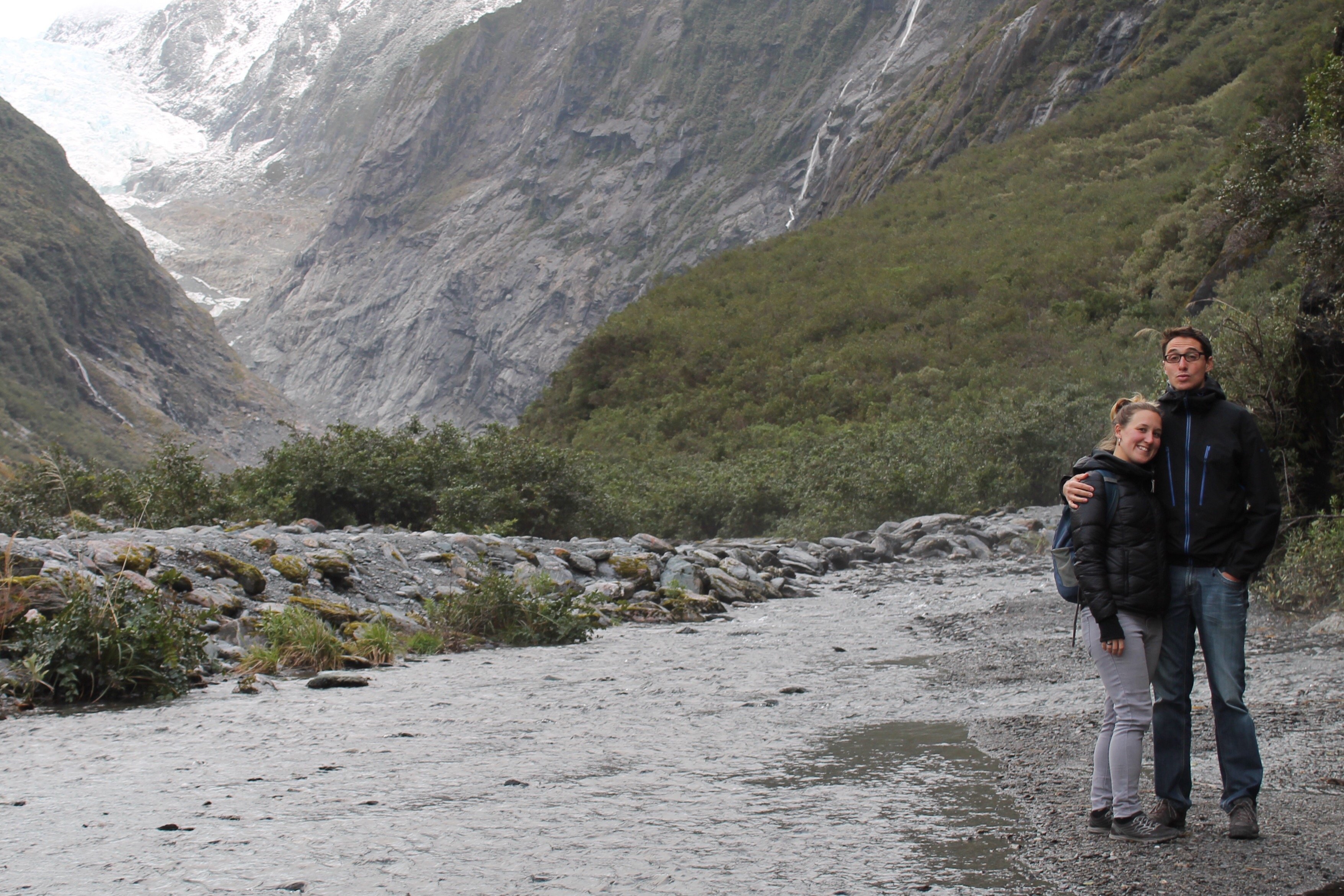 Notre destination numéro 2 sur l’île du sud, Queenstown, était passablement remplie de jeunes collégiens venus pour faire du ski et la fête. La saison tardive et les commentaires mitigés concernant les conditions de ski nous ont convaincus de poursuivre en mode randonneur plutôt que skieur. Nous nous sommes alors dirigés rapido vers Milford Sound et y avons probablement vu les panoramas les plus plaisants pour les yeux! Après un bref retour à Queenstown, pour apporter quelques réparations d’ordre électrique à notre vaisseau, nous sommes partis en direction du glacier Franz Josef. Nous avons rencontré, en chemin, la pire température: déluge constant et rafales de vent à 150 km/h🌪! Nous avons alors eu encore plus d’ennuis avec la voiture, puisqu’une partie du pare-chocs arrière s’est détachée. Julien a dû en arracher, au grand désespoir de Mev, le reste à grands coups de pied, au milieu de la tempête, faute d’outils. Le vent et le grésil dans la face et l’irritation à son comble – une belle image et un moment mémorable, s’il en est un! Le petit répit de camping dans une auberge était le bienvenu.