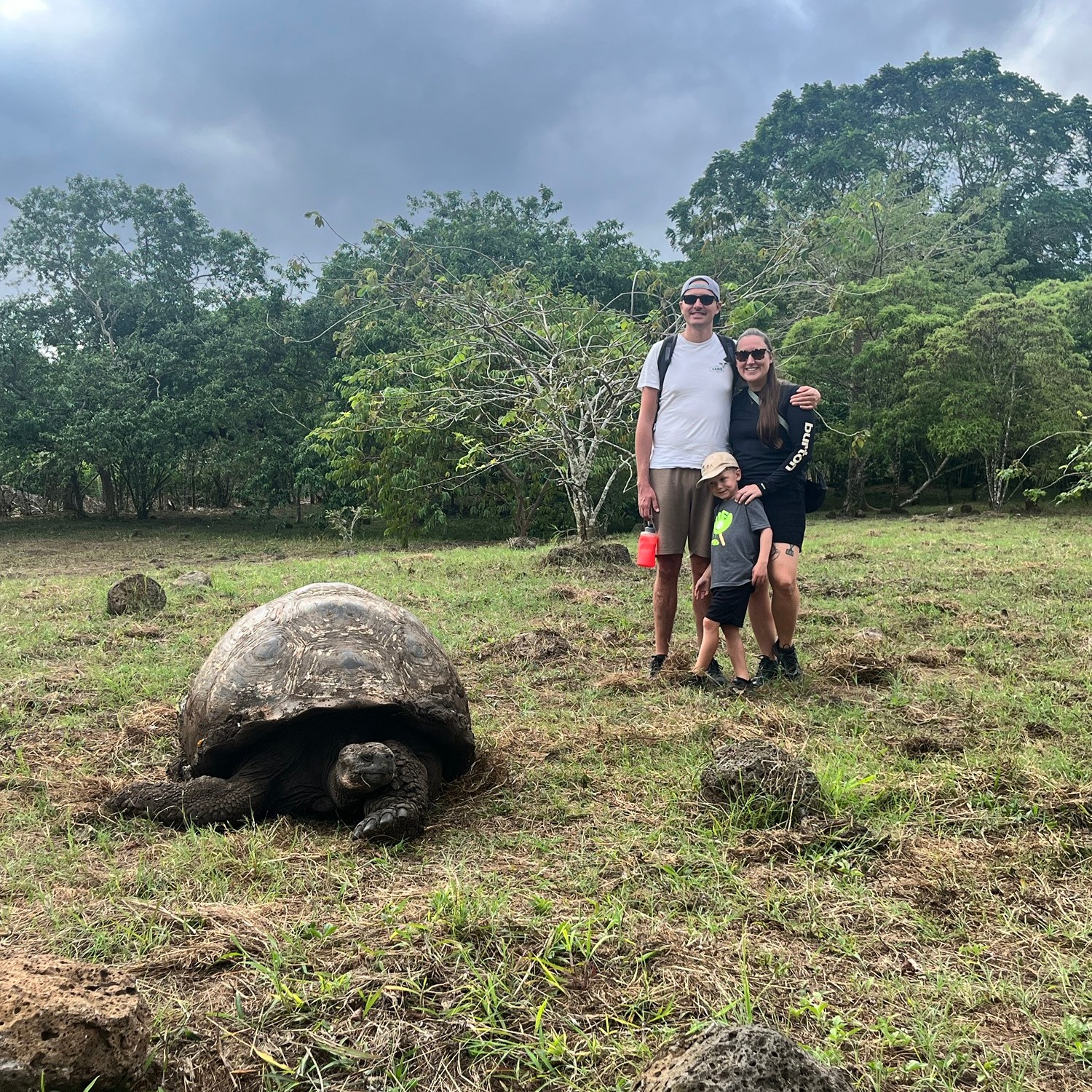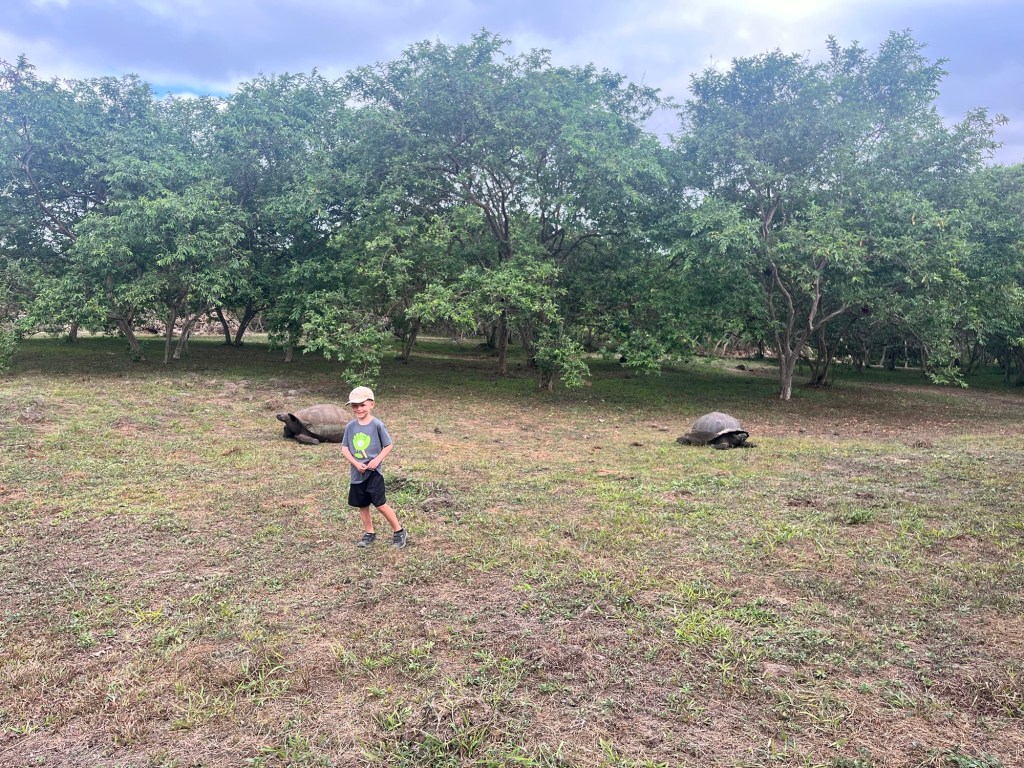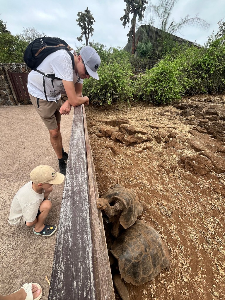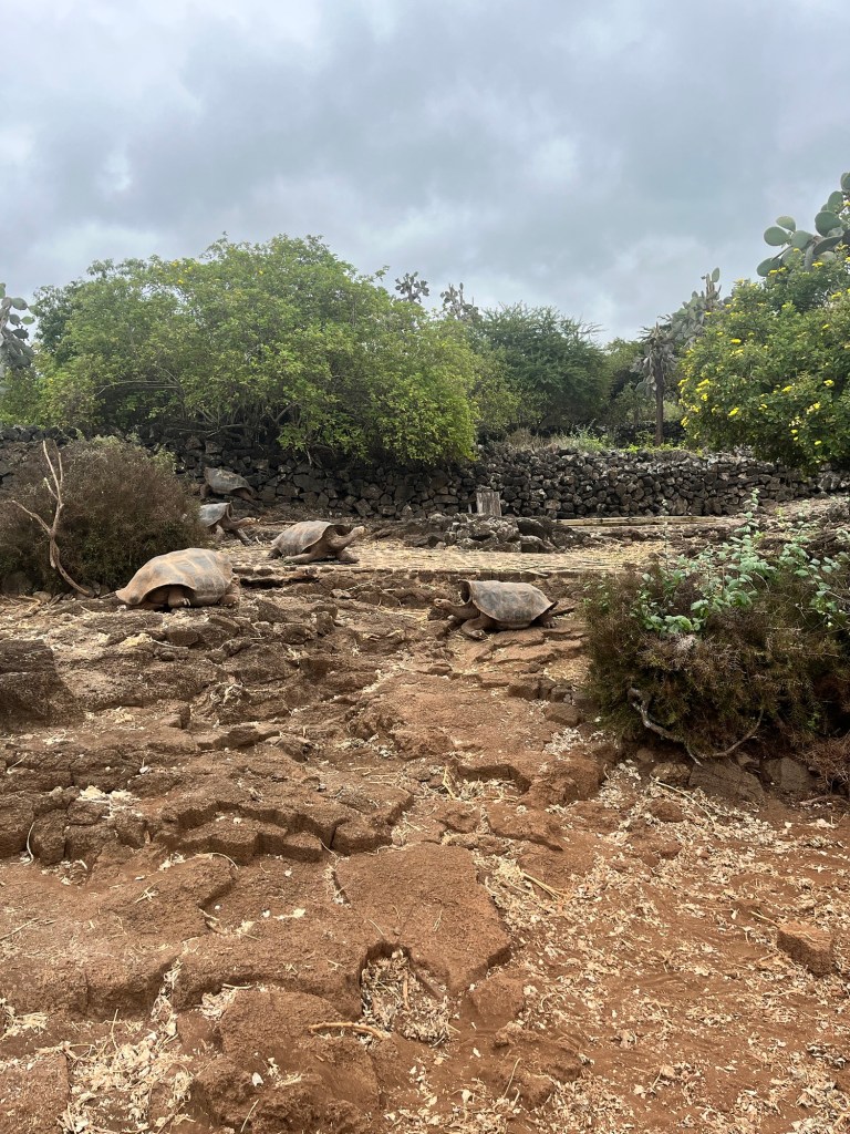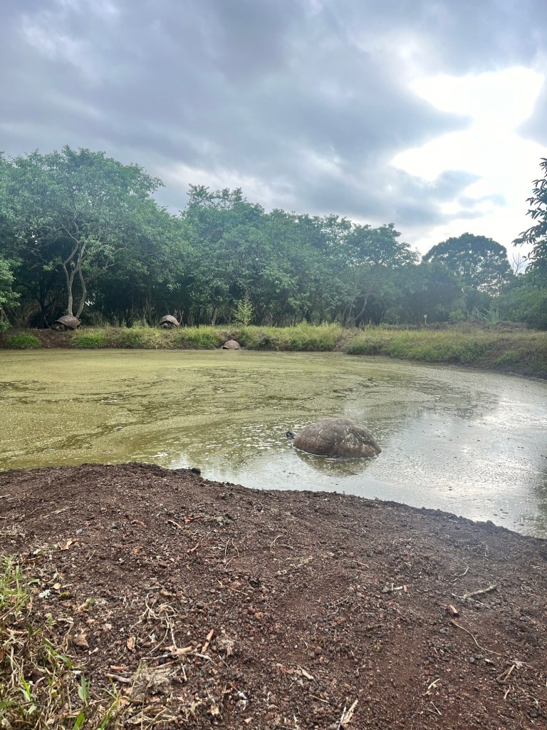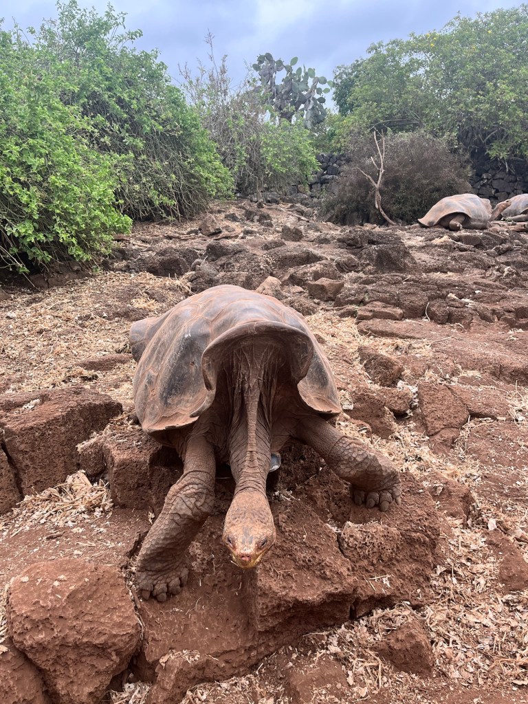 Un court vol où nous étions entourés d’un groupe d’une quarantaine d’écoliers plus tard, et après avoir payé une seconde taxe 😳 pour mettre les pieds dans cet endroit sublime, pris un autobus pour se rendre au traversier, un traversier et un taxi, nous étions enfin sur l’île de Santa Cruz! Après notre arrivée à l’hôtel aux allures de château, nous avons commencé notre visite par la station Charles Darwin, permettant notre premier contact avec de fabuleuses tortues terrestres géantes!