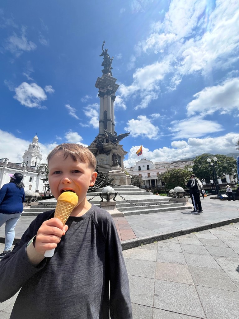 Enchantés d’avoir pu admirer la faune de ces îles incroyables, nous avons ensuite mis le cap sur Quito pour notre dernière visite citadine. Nous y avons fait le tour des 1001 églises, dont certaines absolument somptueuses. Non contents de notre dose d’expérimentations, nous y avons goûté quelques spécialités locales ainsi que des sauterelles séchées 😕!
